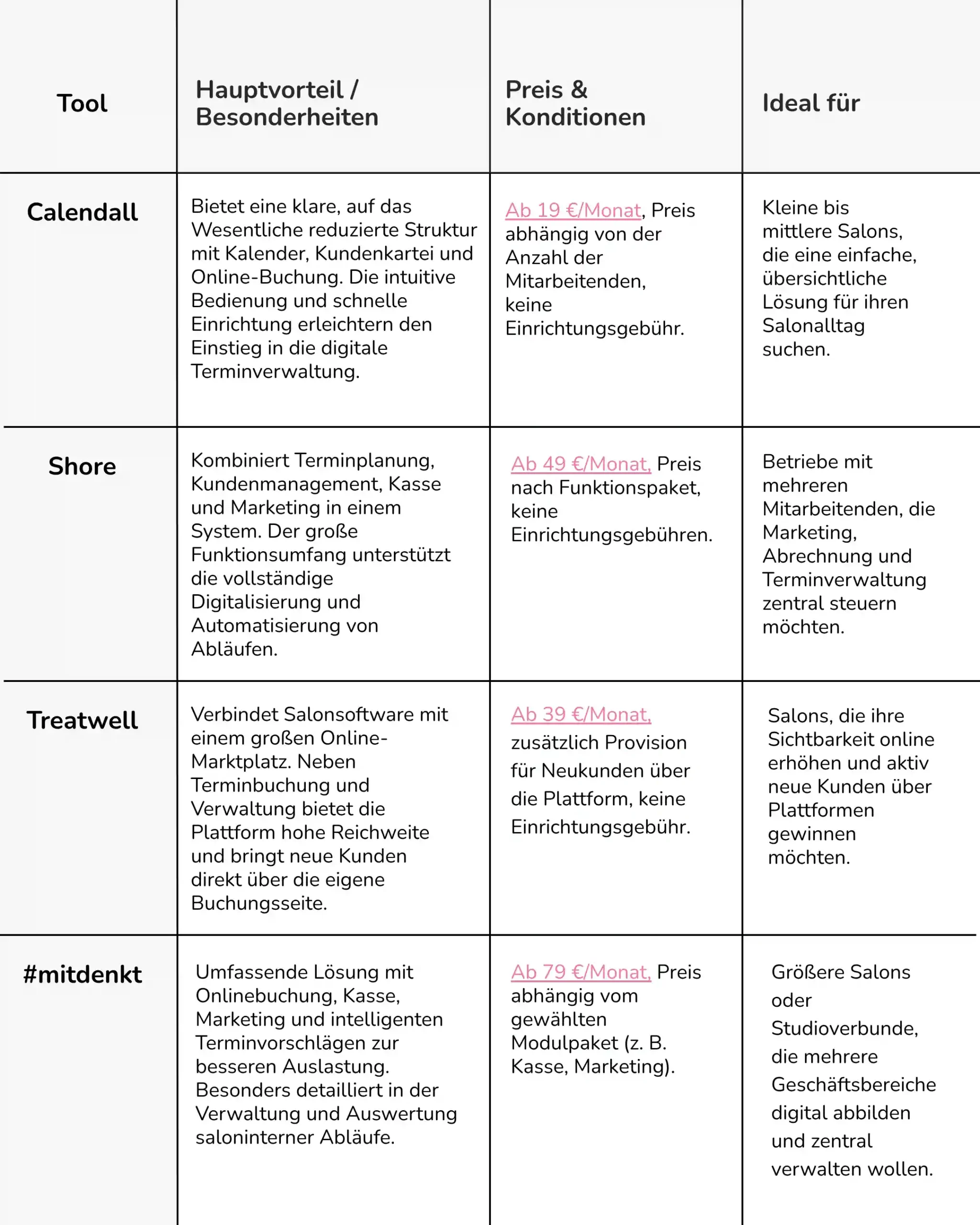 - Modulare Systeme wie Calendall starten ab 19 € im Monat und wachsen mit mit – vom Ein-Personen-Studio bis zum Team-Salon.